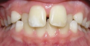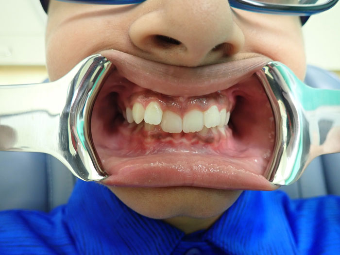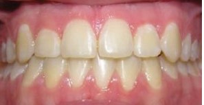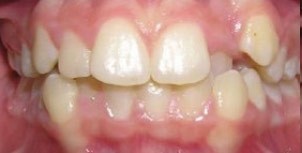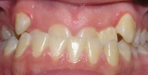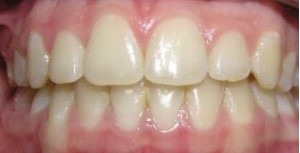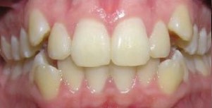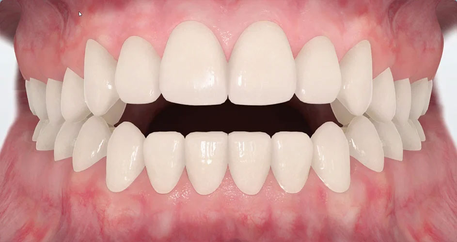 This patient’s upper jaw has spacing and front teeth overlap severely.
