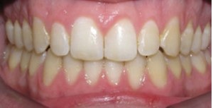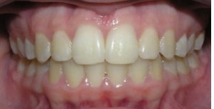 The patient’s upper front teeth extend out over the lower front teeth, forming an overbite.